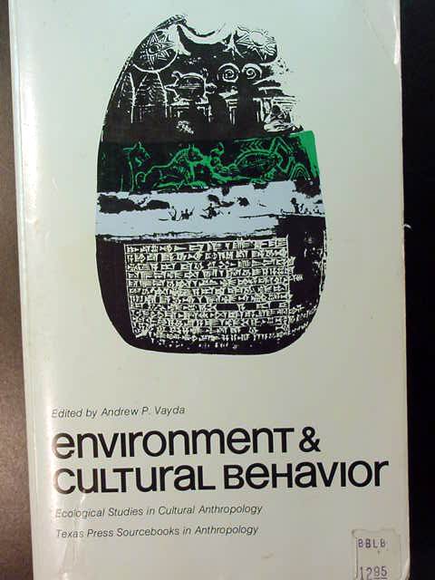 Soft covered book titled ENVIRONMENT & CULTURAL BEHAVIOR - ECOLOGICAL STUDIES IN CULTURAL ANTHROPOLOGY edited by Andrew Vayda, 1988.
