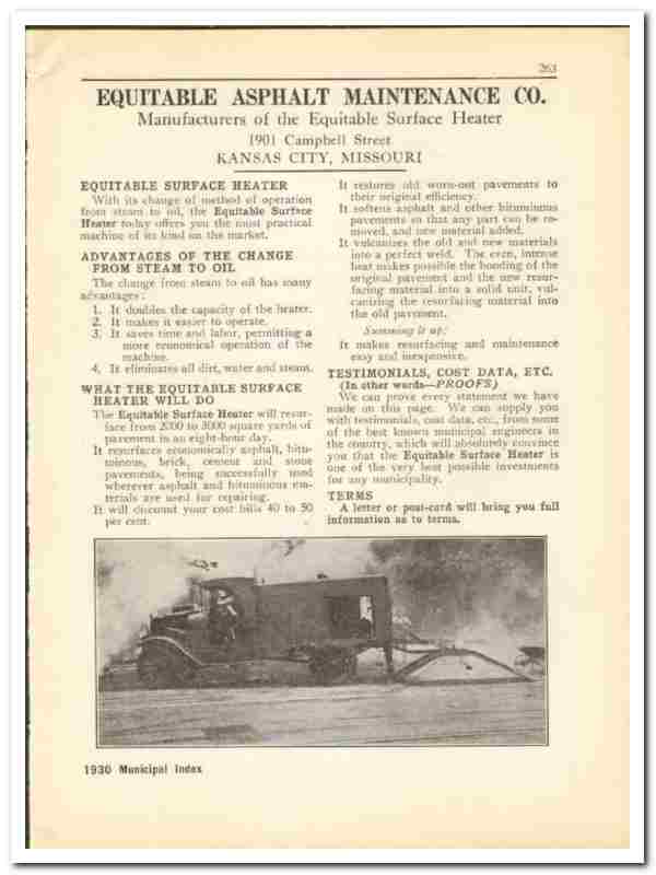 Original 1930 road construction and maintenance trade vintage catalog for the EQUITABLE ASPHALT MAINTENANCE COMPANY. Main office and plant was located at 1901 Campbell Street, Kansas City, MO.