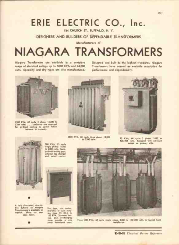 Original electrical trade vintage catalog for ERIE ELECTRIC COMPANY, INC. was located at 124 Church Street, Buffalo, NY. Manufacturers of Niagara Transformers, in complete range of ratings up to 5000 KVA and 44,000 volts. Designed and built to the highest power standards. Specialty and dry types are also manufactured. Disbound from a large 1943 electrical construction materials book, this unique old one page technical specifications brochure would display wonderfully matted and framed. A marvelous addition to your retro electric equipment library.