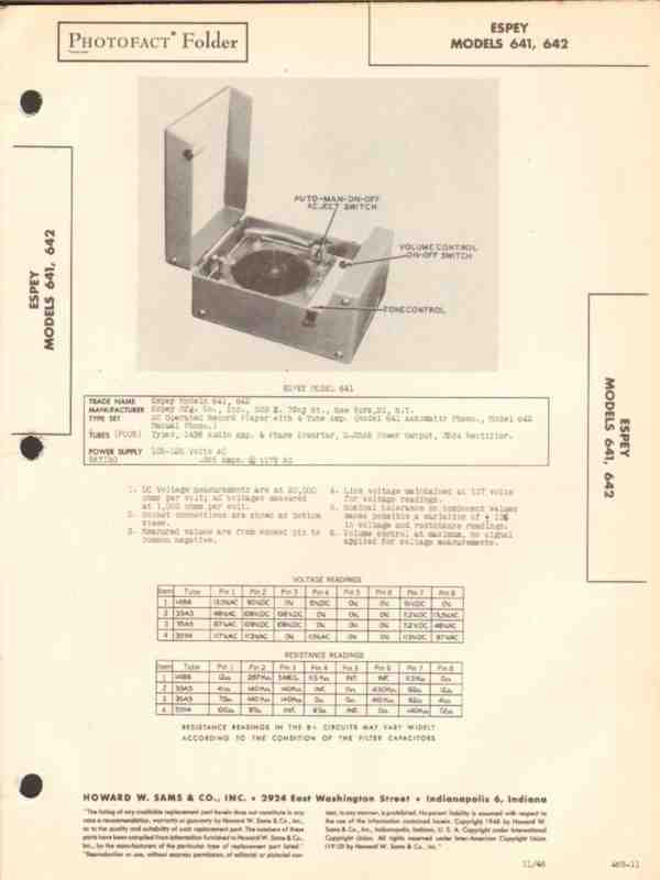 Vintage ESPEY models 641 and 642 phonograph record player with 4 tube amplifier and speaker. Original old Sams Photofact manual includes schematic, layout, alignment instructions, voltage & resistance test charts, repair parts list and description. Dated 1946. 4 pages. Espey Manufacturing Company, Inc. of New York City, NY. This manual would make a sensational accompaniment to your classic phono equipment.