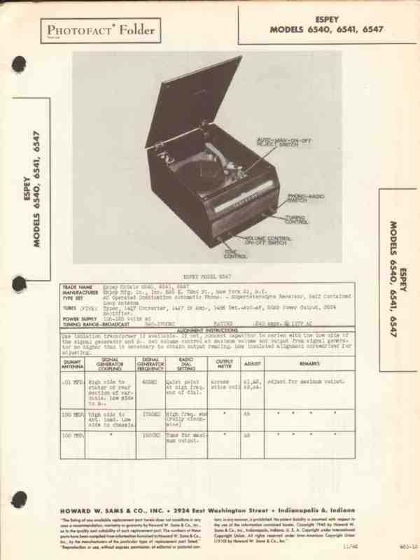 Vintage ESPEY models 6540, 6541 and 6547 combination Superheterodyne 5 tube AM radio receiver with automatic phonograph record changer player. Original old Sams Photofact manual includes schematic, layout, alignment instructions, voltage & resistance test charts, repair parts list and description. Dated 1946. 4 pages. Espey Manufacturing Company, Inc. of New York City, NY. This manual would make a sensational accompaniment to your classic retro radio / phono equipment.