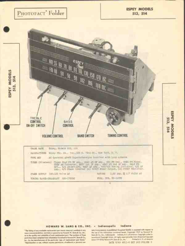 Vintage ESPEY models 513 and 514 19 tube AM FM Superheterodyne radio tuner. Original old Sams Photofact manual includes schematics, layouts, alignment, adjustments, parts list. 10 pages. Dated 1949. Espey Manufacturing Company, Inc. of New York City, NY.