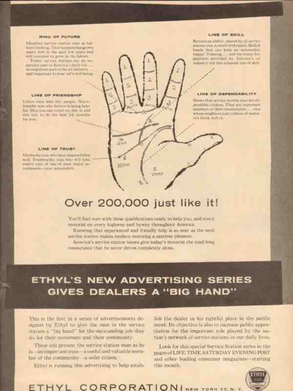 ethyl corporation 1957 advertising dealer big hand gasoline vintage ad