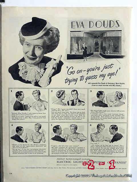 Original vintage magazine ad for the Electric Light and Power Company. Features EVA DOUDS HAT STORE of Clarksburg, WV. West Virginia. Old 1946 advertisement. Would look sensational matted and framed!