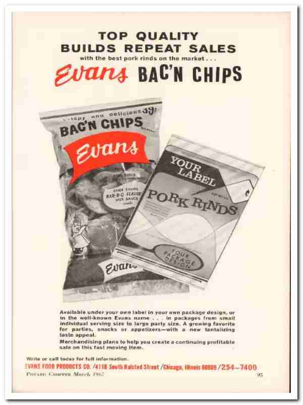evans food products company 1967 bacn chips pork rind snack vintage ad