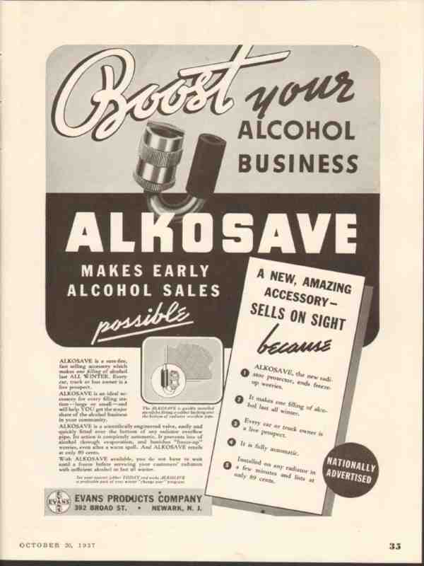 Evans Products Company 1937 Vintage Ad Alkosave Boost Alcohol Business