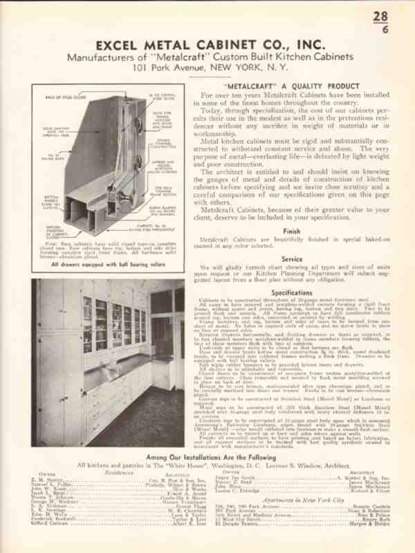 Original kitchen trade vintage catalog for EXCEL METAL CABINET COMPANY, INC. was located at 101 Park Avenue, New York City, NY. Manufacturers of Metalcraft Custom Built Kitchen Cabinets. Installed in homes of E. M. Statler, Samuel Fuller, John Kiser, Jacob Reiss, George Wedener, Frederick Rockwell and Gifford Cochran. All kitchens and pantries in the White House, Washington, DC. Lorenzo W. Winslow, Architect. Unbound from a large 1938 architectural catalog, this unique old one page technical brochure would exhibit beautifully matted and framed. A fantastic addition to your retro kitchen collection.