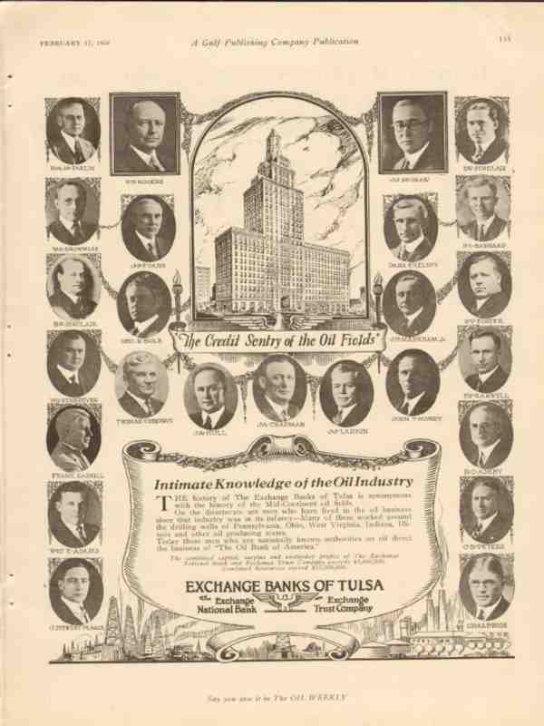 Original oil and gas trade magazine vintage ad for EXCHANGE BANKS OF TULSA. The Exchange National Bank and Exchange Trust Company. Intimate Knowledge of the Oil Industry. The Credit Sentry of the Oil Fields. R. M. Farlin, H.H. Rogers, W.A. Brownlee, J.H. Evans, H.F. Sinclair, Geo. S. Bole, H.L. Standeven, Thomas Chestnut, Frank Haskell, Robert E. Adams, J. Stewert Pearce, J.A. Hull, J.A. Chapman, J.J. Larkin, J.J. McGraw, W.E. Sinclair, Dana H. Kelsey, H.G. Barnard, H.V. Foster, J.H. Markham, Jr., John Y. Murry, E.P. Harwell, H.C. Ashby, C.B. Peters, Chas. E Bush. Old 1928 petroleum industry banking and finance advertisement.