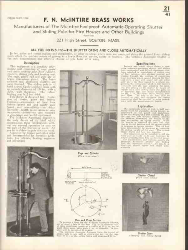 Original door trade vintage catalog for F. N. McINTIRE BRASS WORKS, was located at 221 High Street, Boston, MA. Manufacturers of the Sliding Pole for Fire Houses, McIntire Foolproof Automatic-Operating Shutter. In fire, police and rescue stations and dormitories, or other buildings where men are quartered above the ground floor, sliding poles afford the quickest means of getting to a lower floor for service, safety or business. Disbound from a large 1938 construction materials book, this unique old one page technical specifications brochure would display wonderfully matted and framed. A marvelous addition to your retro architectural design library.
