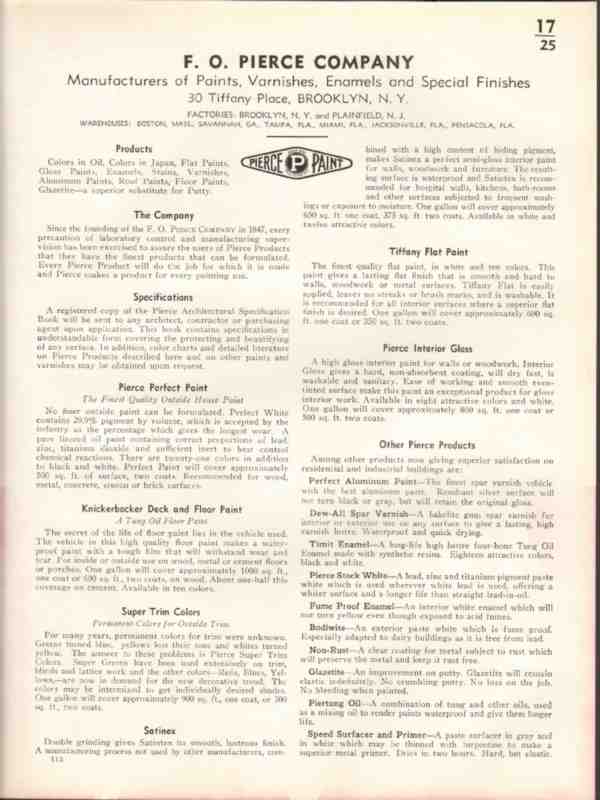Original paint trade vintage catalog for F. O. PIERCE COMPANY, was located at 30 Tiffany Place, Brooklyn, NY. Manufacturers of Paints, Varnish, Enamel and Special Finishes. Products include Pierce Perfect paint, Knickerbocker Deck, Satinex and Tiffany Flat. Unbound from a large 1938 engineering catalog, this unique old one page technical brochure would display beautifully matted and framed. A fantastic addition to your retro paint and coatings library.