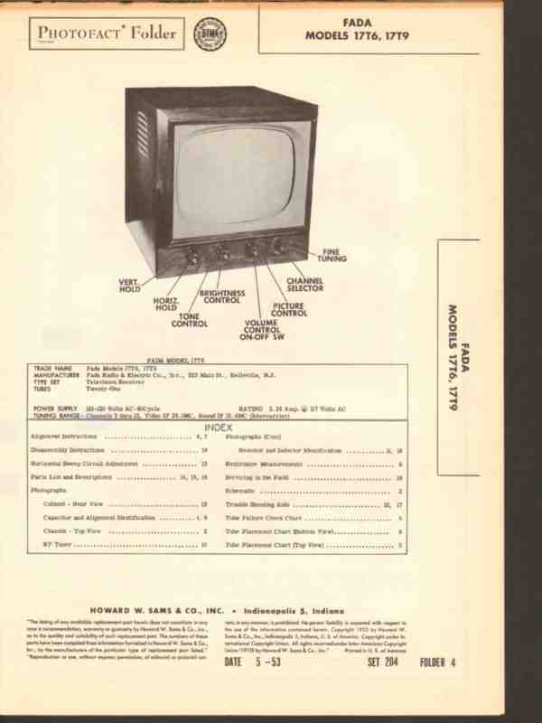 fada model 17t6 17t9 tv television receiver sams photofact manual