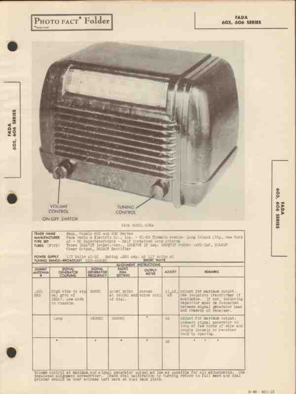 fada model 605 606 5 tube am radio receiver sams photofact manual