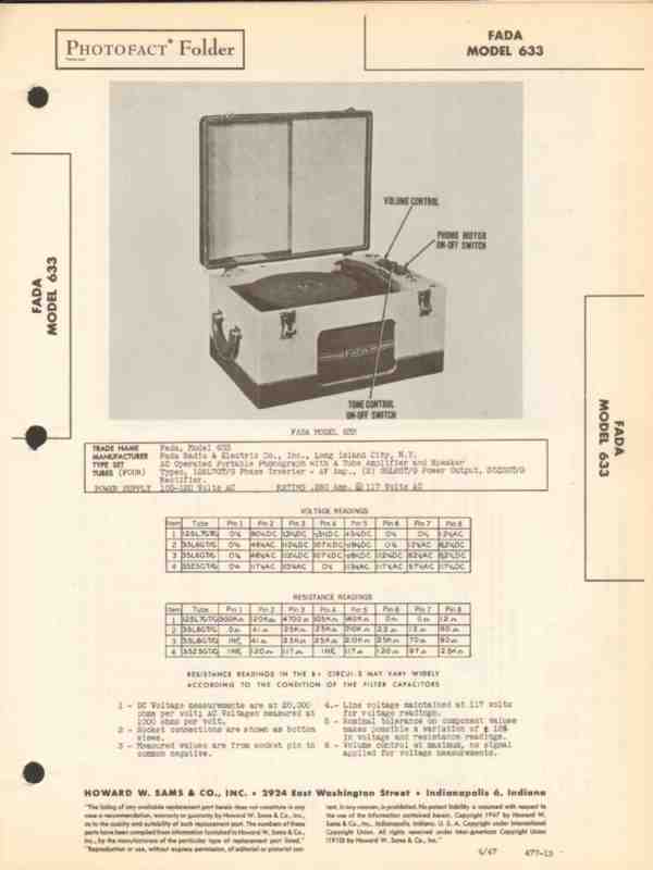 fada model 633 phonograph record player 4 tube sams photofact manual