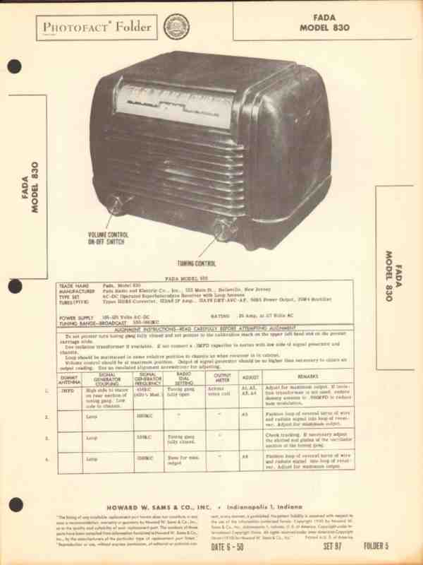 Vintage FADA model 830 5 tube Superheterodyne AM radio receiver. Original old Sams Photofact manual includes schematic, layouts, alignment info, repair parts list. 4 pages. Dated 1950. Fada Radio and Electronics Inc., of Belleville, NJ. This manual would make a sensational accompaniment to your vintage audio equipment.
