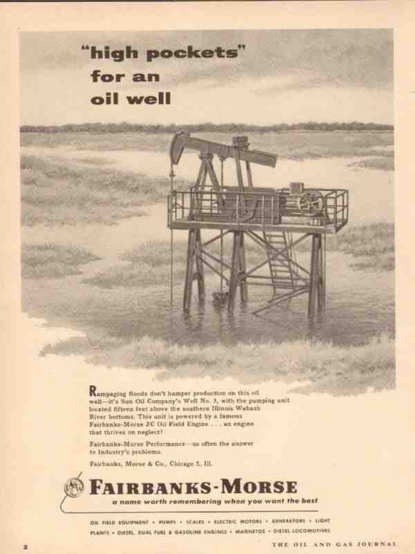 Original oil and gas trade magazine vintage ad for FAIRBANKS MORSE & COMPANY of Chicago, IL. High Pockets for an Oil Well. AC Oil Field Engine on Sun Oil Company's Well No. 3 above the southern Illinois Wabash River bottoms. Unique 1954 old oilfield petroleum pumping industry equipment magazine advertisement.