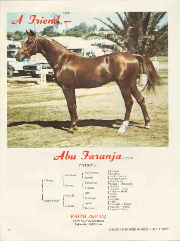Original old equestrian trade magazine vintage ad for FAITH DuVALL in Lakeside, CA. Abu Faranja sire Tabanja, dam Night Wind. Lineage includes Abu Baha, Ferlana, Witez II, Lankara, Abu Farwa, Surrab, Tamarlane, Feranta, Ofir, Federacja, Ankar, Birlanty, Rabiyas, Rissletta, Latif, Howija-Raseyn, Tamar, Joonata, Kuhailan Haifi, Dziwa, Burgas, Koalicja, Antez, Reshsafa, Rabiyas, Rayza. Up for stud. This unique 1972 Arabian horse breeding advertisement would display beautifully matted and framed.