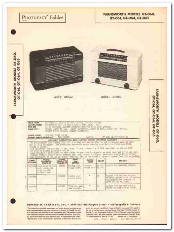 Vintage Radio Service Manual - FARNSWORTH model GT-060, GT-061, GT-064  & GT-065 6-tube Superheterodyne AM radio receiver. Manufactured by Farnsworth Television and Radio Corp., of Fort Wayne, IN. Dated 1948. Original old Sams Photofact manual includes schematic, layout, alignment instructions, voltage & resistance test chart, repair parts list and description.  This manual would make a sensational accompaniment to your retro audio equipment.