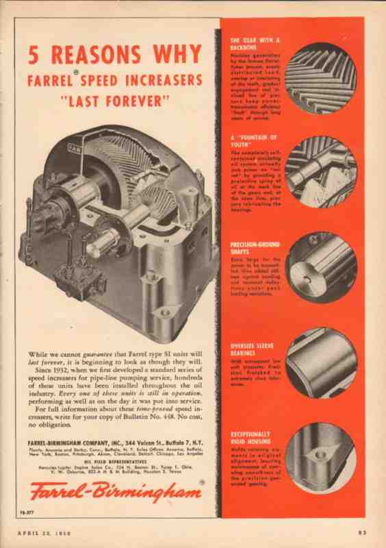 Original oil and gas trade magazine vintage ad for FARREL-BIRMINGHAM COMPANY, INC. was located at 344 Vulcan Street, Buffalo, NY. Reasons Why Speed Increasers Last Forever. They have rigid housing, oversize sleeve bearings, precision ground shafts. This unique 1950 old petroleum industry magazine advertisement would display beautifully matted and framed.