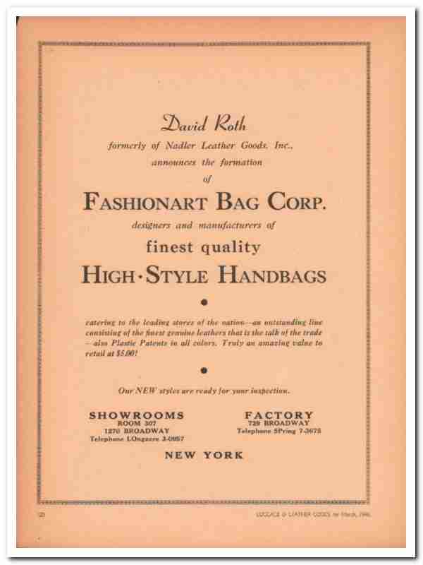 Original leather goods trade magazine vintage ad for FASHIONART BAG CORPORATION. Main office and showroom was located at 1270 Broadway, New York, NY. The Factory was located at 729 Broadway, New York, NY. Mr David Roth, formerly of Nadler Leather Goods, Inc., announces the formation of Fashionart Bag Corporation, designers and manufacturers of finest quality High-Style Handbags. Outstanding line consisting of the finest genuine leathers that is the talk of the trade, also Plastic Patents in all colors. This unique 1946 old handbag industry magazine advertisement would display wonderful matted and framed. Nice graphics.