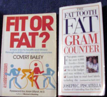 2 diet books, one titled THE FAT TOOTH FAT GRAM COUNTER by Joseph Piscatella. 1993, 304 pages, and the other book titled FIT OR FAT? A New Way to Health and Fitness through Nutrition and Aerobic Exercise by Covert Bailey, 1978, 107 pages.