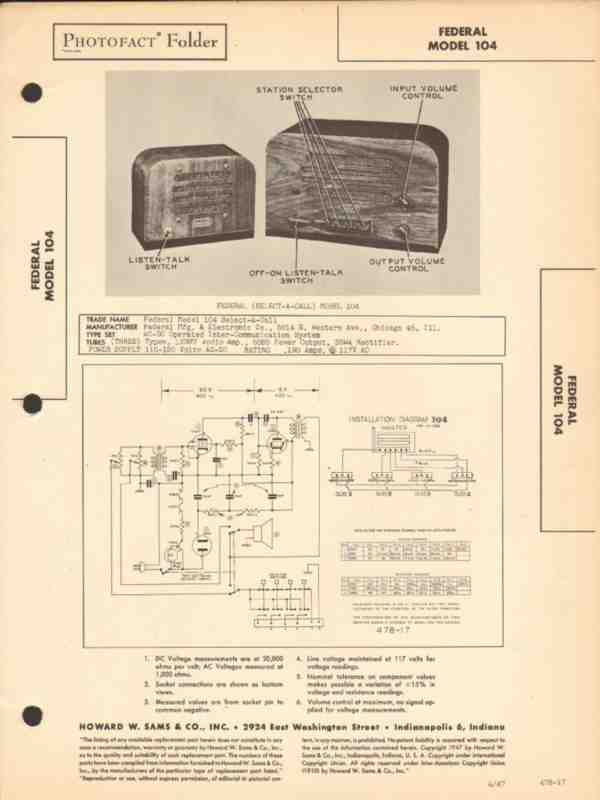 Vintage FEDERAL model 104 Select-A-Call intercom system. Original old Sams Photofact manual includes schematic, layout, voltage & resistance test charts and repair parts list. 2 pages. Dated 1947. Federal Manufacturing and Engineering Corp., of Brooklyn, NY. This manual would make a sensational accompaniment to your classic retro electronic office equipment.