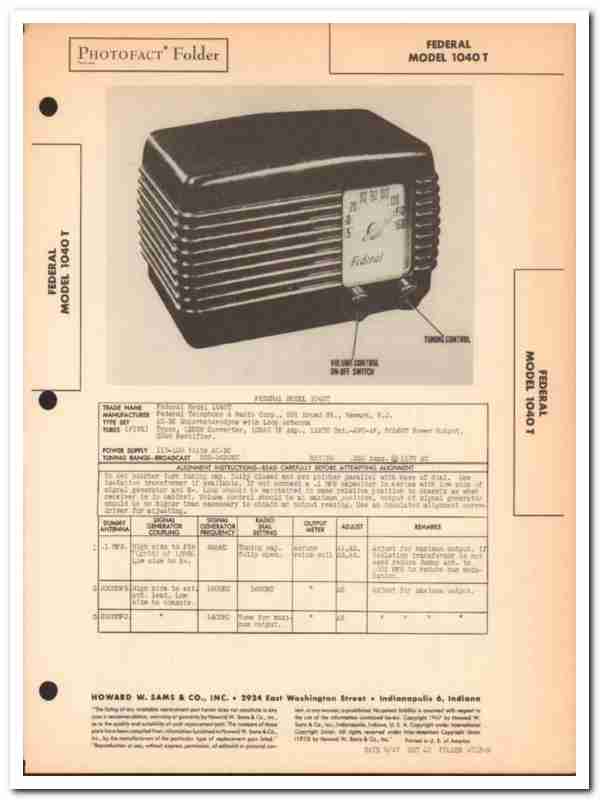 federal model 1040t 5-tube am radio receiver sams photofact manual