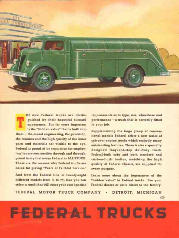 Original old petroleum trucking trade magazine vintage ad FEDERAL MOTOR TRUCK COMPANY of Detroit, MI. Consider hidden value, sound engineering, precision, stamina and high quality of the inner parts. This unique 1937 commercial fleet two sided advertisement would display beautifully matted and framed.