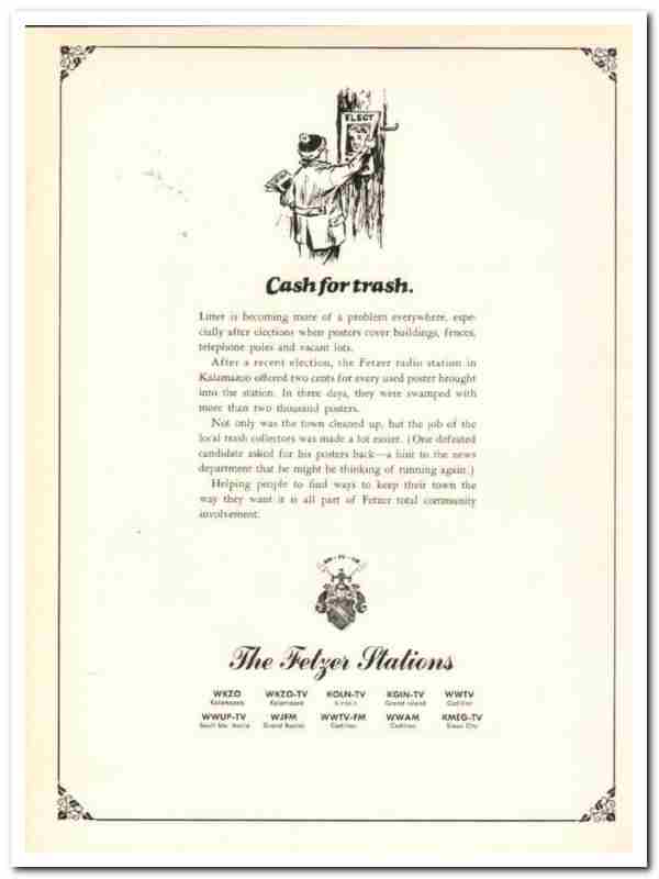 Original broadcasting media vintage magazine ad for FETZER STATIONS. WKZO Kalamazoo, MI Cash for Trash campaign. Letter is a problem, especially after elections when posters cover buildings, fences, telephone poles and vacant lots. After a recent election, the radio station offered two cents for every used poster brought into the station. In three days, they were swamped with more than two thousand posters. Not only was the town cleaned up, but the job of the local trash collectors was made a lot easier.