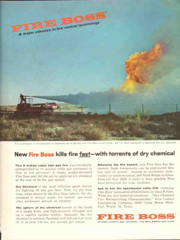 Original oil and gas trade magazine vintage ad for FIRE CONTROL ENGINEERING COMPANY of Fort Worth, TX. New Fire Boss Fills Fire Fast with Torrents of Dry Chemical. Fire knockdown is accomplished at distances up to 160 feet with Fire Boss turret nozzle. This unique 1962 petroleum industry chemical magazine advertisement would display beautifully matted and framed. Nice graphics.