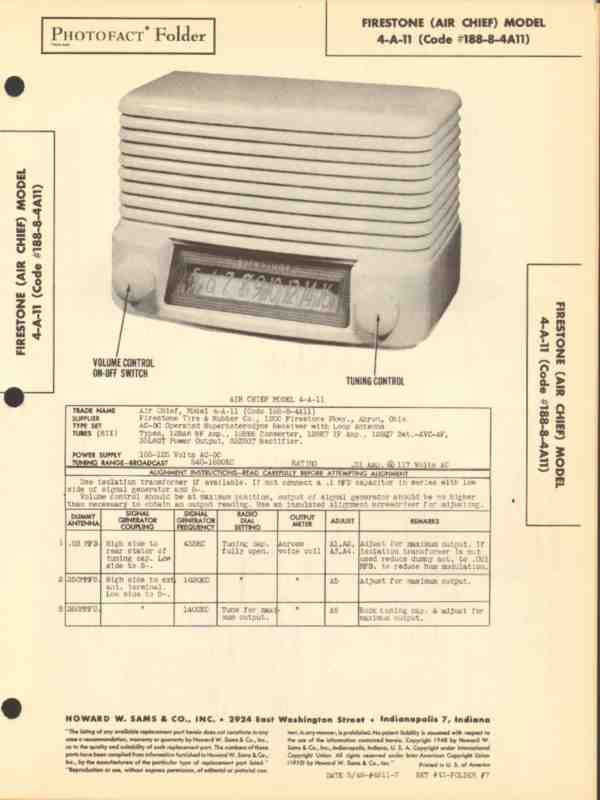 Vintage FIRESTONE AIRCHIEF model 4-A-11 6 tube Superheterodyne AM radio receiver. Original old Sams Photofact manual includes schematics, layouts, alignment, adjustments, parts list. 4 pages. Dated 1948. Firestone Tire and Rubber Company of Akron, OH.