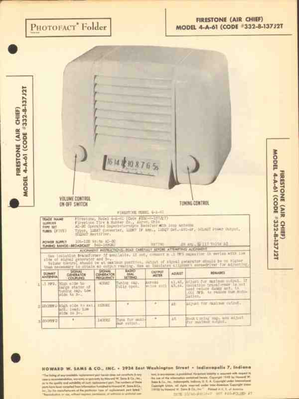 Vintage FIRESTONE AIRCHIEF model 4-A-61 (Code # 332-8-137J2T) 5 tube Superheterodyne AM radio receiver. Original old Sams Photofact manual includes schematic, layouts, alignment adjustments, repair parts list. 4 pages. Dated 1948. Firestone Tire and Rubber Company of Akron, OH. This manual would make a sensational accompaniment to your vintage audio equipment.