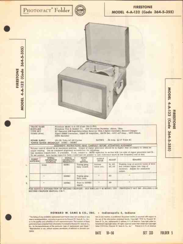 Vintage FIRESTONE model 4-A-132 (Code 364-5-355) 5 tube combination Superheterodyne AM radio receiver with 4-speed automatic record changer phonograph. Original old Sams Photofact manual includes schematic, layout, alignment instructions, voltage & resistance test chart, repair parts list and description.4 pages. Dated 1956. This manual would make a sensational accompaniment to your classic radio phono equipment.