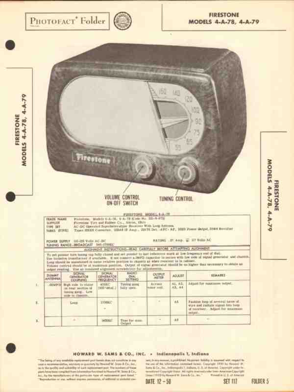 Vintage FIRESTONE model 4-A-78 and 4-A-79 5 tube Superheterodyne AM radio receiver with electric clock. Original old Sams Photofact manual includes schematic, layouts, alignment info, repair parts list. 4 pages. Dated 1950. Firestone Tire and Rubber Company of Akron, OH.
