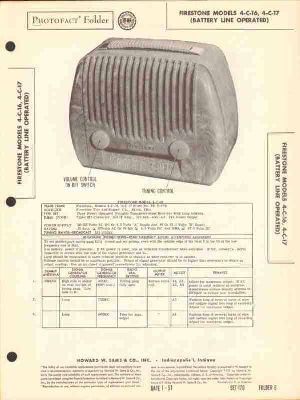 Vintage FIRESTONE models 4-C-16 and 4-C-17 4 tube Superheterodyne AM radio receiver. Original old Sams Photofact manual includes schematic, layouts, alignment info, repair parts list. 4 pages. Dated 1951.