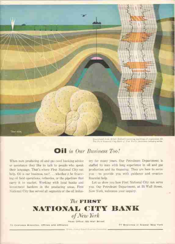 Original vintage magazine ad, FIRST NATIONAL CITY BANK OF NEW YORK, of 55 Wall Street, New York City, NYC. OIL is our business too. Pictured is a reproduction of a Robert Hallock painting depicting oil exploration for the First National City Bank of New York's American industry series. Old 1959 petroleum industry financing advertisement. Would look sensational matted and framed. Nice graphics.
