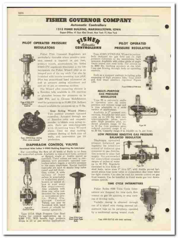 Original 1951 Oil and Gas trade vintage catalog for the FISHER GOVERNOR COMPANY. Main office and plant was located at 1213 Fisher Building, Marshalltown, IA.