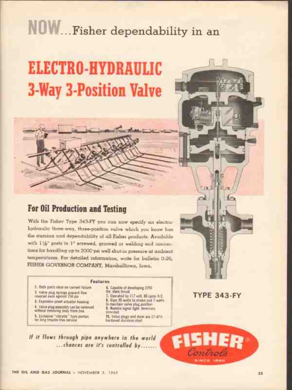 Original oil and gas trade magazine vintage ad for FISHER GOVERNOR COMPANY of Marshalltown, IA. Electro-Hydraulic 3-Way 3-Position Valve for Oil Production and Testing. Type 343-FY. This unique 1962 old petroleum production industry magazine advertisement would display beautifully matted and framed.