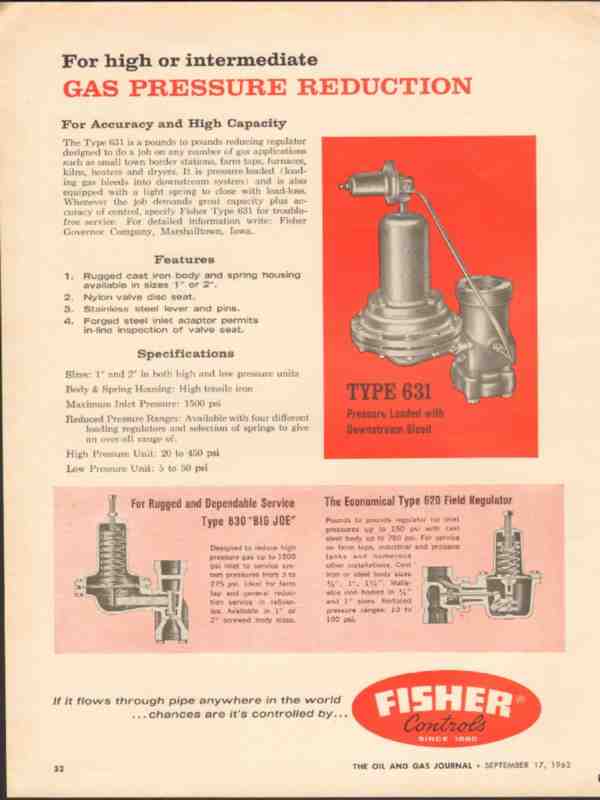 Original oil and gas trade magazine vintage ad for FISHER GOVERNOR COMPANY of Marshalltown, IA. For High or Intermediate Gas Pressure Reduction for Accuracy Control and High Capacity. This unique 1962 old petroleum refining industry magazine advertisement would display beautifully matted and framed.