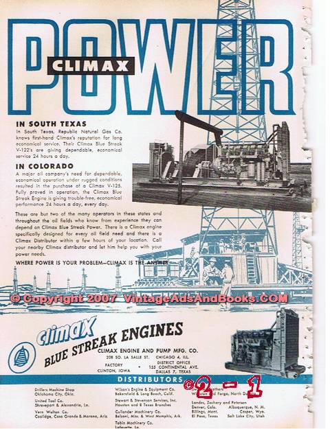 Original oil and gas trade magazine vintage ad for FISHER GOVERNOR COMPANY of Marshalltown, IA. The Name Fisher on a Diaphragm Motor Valve Tells You That It Is Custom Designed, Engineered and Manufactured to Fit Your Application - With the Ultimate in Dependability, Economy and Trouble-Free Performance. World leader in research for better pressure and liquid level control. Unique 1955 old oilfield petroleum industry equipment magazine advertisement. On the reverse side is an ad for CLIMAX ENGINE & PUMP MANUFACTURING COMPANY of Chicago, IL. Climax Power. In South Texas, Republic Natural Gas Company knows first-hand Climax's reputation for long economical service. Their Climax Blue Streak V-122's are giving dependable, economical service 24 hours a day. Where Power Is Your Problem, Climax Is The Answer. Climax Blue Streak Engines. Old 1955 petroleum industry drilling equipment advertisement. Approximate size 9 x 12 inches. Slight binding crease upper left side of the page.