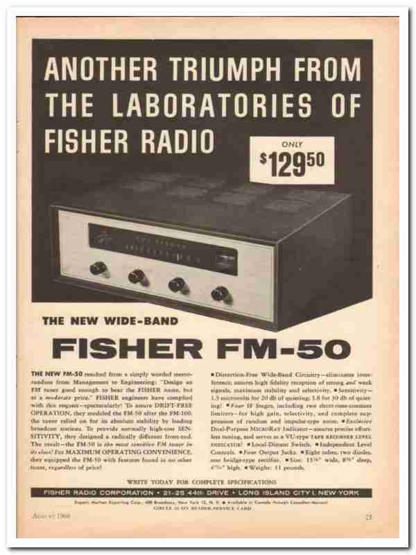 Original vintage ad for FISHER RADIO CORPORATION. FM-50 Wide-Band Stereo Tuner, with distortion-free circuitry. Another triumph from the laboratories of Fisher. \Main office was located at 21-25 44th Drive, Long Island City, NY.