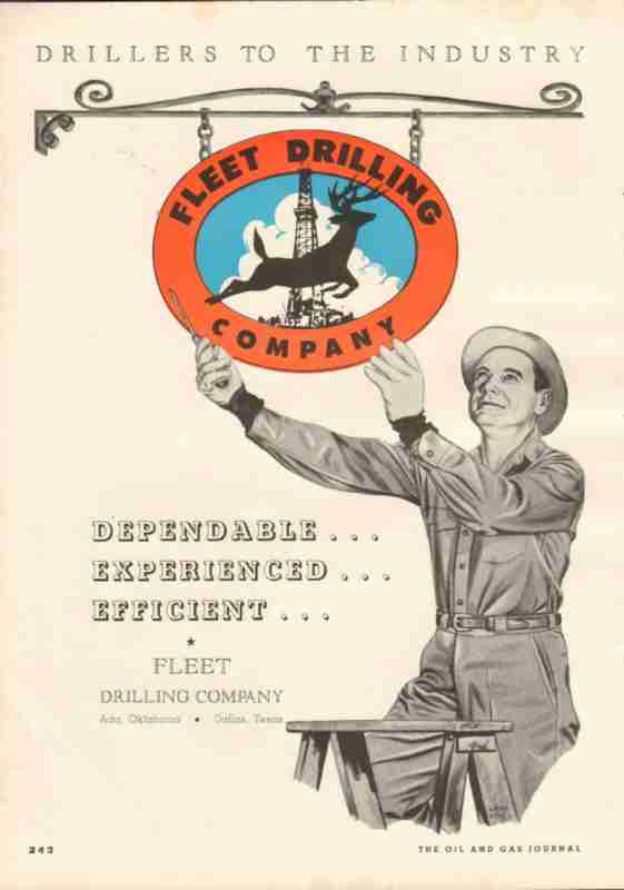 Original oil and gas trade magazine vintage ad for FLEET DRILLING COMPANY, of Ada, OK. and Dallas, TX. Dependable. Experienced. Efficient. This unique 1951 old oilfield petroleum drilling industry magazine advertisement would look sensational matted and framed. Great graphics. Art work by Beele. Approximate size 9 x 12 inches.