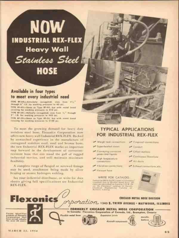 Original oil and gas trade magazine vintage ad for FLEXONICS CORPORATION, was located at 1345 South Third Avenue, Maywood, IL. Now Industrial Rex-Flex Heavy Wall Stainless Steel Hose Available in Four Types. Formerly Chicago Metal Hose Corporation. Unique 1954 old petroleum oilfield and refining process equipment magazine advertisement.