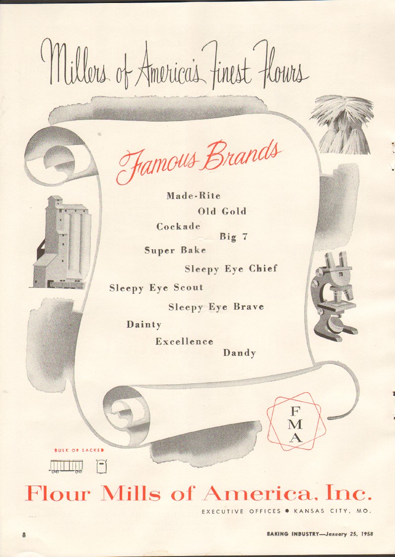 Original commercial bakery trade magazine vintage ad for FLOUR MILLS OF AMERICA, INC in Kansas City, MO. Millers of famous brands, finest flours. Made-Rite, Old Gold, Cockade, Big 7, Super Bake, Sleepy Eye Chief, Scout, Brave, Dainty, Excellence, Dandy. 1958 unique old baking supply industry advertisement.