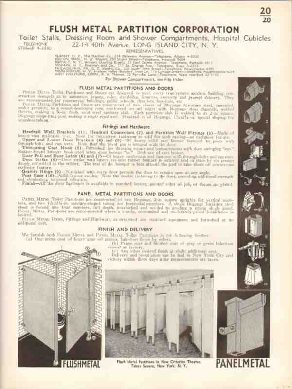 Original wall trade vintage catalog for FLUSH METAL PARTITION CORPORATION. Main office and factory was located at 22-14 40th Avenue, Long Island City, NY. Manufacturers of Metal Partitions. Products include Toilet Stalls, Doors, Dressing Room and Shower Compartments, Hospital Cubicles, Fittings and Hardware. Flush Metal Partitions shown in New Criterion Theatre, Times Square, NYC. Unbound from a large 1938 architectural catalog, this unique old one page technical brochure would display wonderful matted and framed. Nice graphics. A terrific addition to your retro wall construction library.