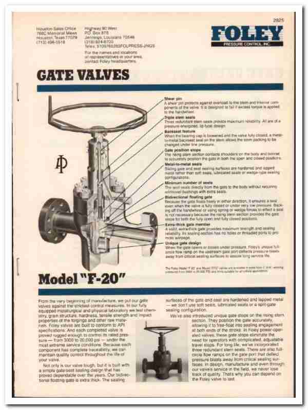 Original 1984 Oil and Gas trade vintage catalog for FOLEY PRESSURE CONTROL, INC. Main office and plant was located at Highway 90 West, Jennings, LA. Sales office was at 766C Memorial Mews, Houston, TX.