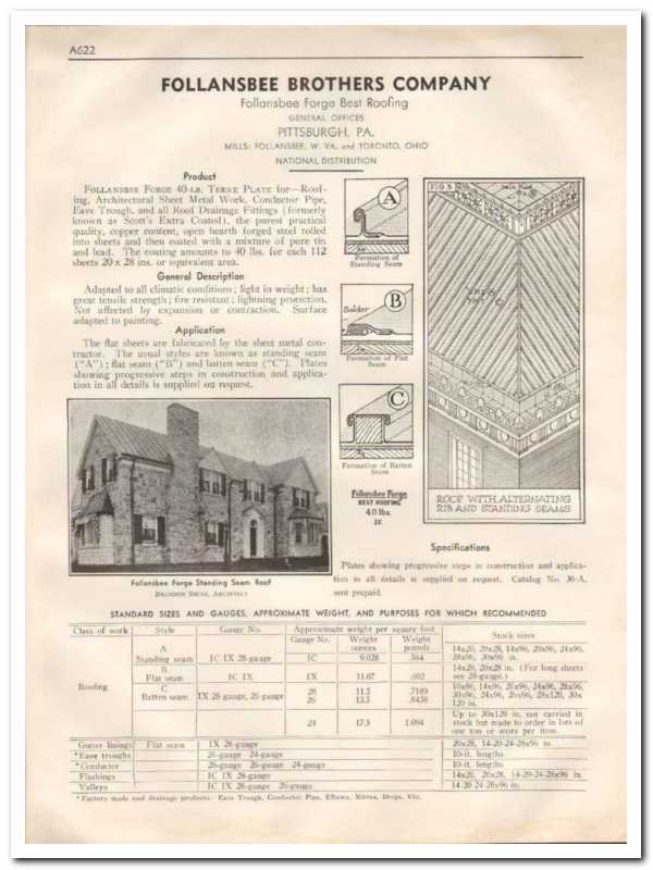 Original roofing trade vintage catalog for FOLLANSBEE BROTHERS COMPANY. General offices were located in Pittsburgh, PA. Manufacturers of Forge Terne Plate for roofing, architectural sheet metal work, conductor pipe, eave trough and all roof drainage fittings. Chart with standard sizes and gauges, weight and purposes provided. Unbound from a large 1933 architectural catalog, this unique old one page technical specifications brochure would display beautifully matted and framed. A fantastic addition to your retro roofing construction library. Light damp stain on top and bottom page edges.