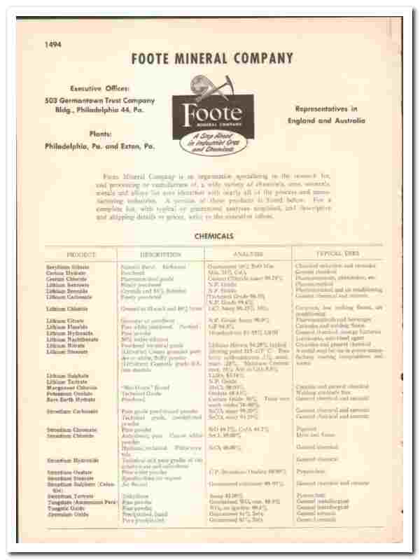 'Foote Mineral Company is an organization specializing in research for and processing or manufacture of a wide variety of chemicals, ores, minerals, metals and alloys for uses identified with nearly all of the process and manufacturing industries. A portion of these products are listed'.