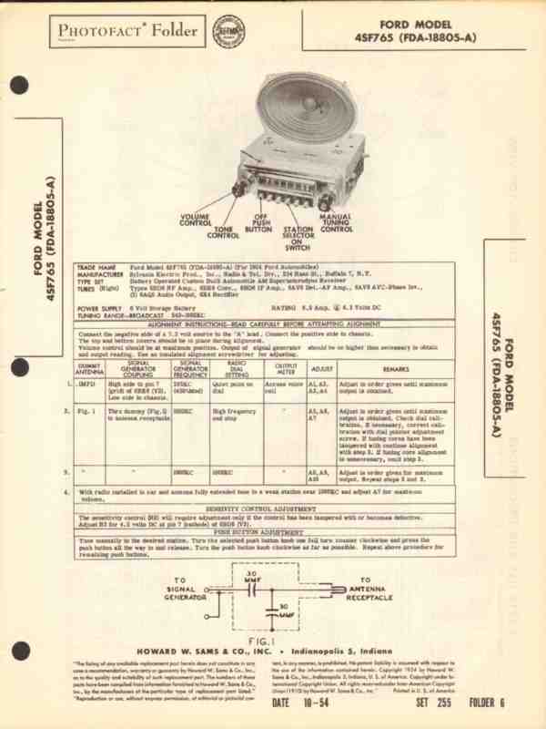 Vintage FORD model 4SF765 (FDA-18805-A) 8 tube Superheterodyne AM car radio receiver. Original old Sams Photofact manual includes schematic, layout, alignment instructions, voltage & resistance test chart, repair parts list and description. 4 pages. Dated 1954. Sylvania Electic Products, Inc., of Buffalo NY. This manual would make a sensational accompaniment to your classic radio equipment.
