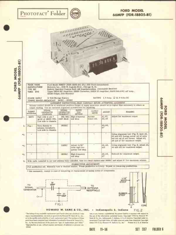 Vintage FORD model 66MFP (FDR-18805-B1) (for 1956 Ford automobiles) 6 tube Superheterodyne AM car radio receiver. Original old Sams Photofact manual includes schematic, layout, alignment instructions, voltage & resistance test chart, repair parts list and description. 4 pages. Dated 1956. Motorola Inc. of Chicago, IL. This manual would make a sensational accompaniment to your classic radio equipment.