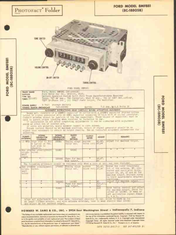 Vintage FORD model 8MF881 (8C-188058) 8 tube AM car radio receiver. Original old Sams Photofact manual includes schematic, layouts, alignment adjustments, repair parts list. 5 pages. Dated 1948. Ford Motor Car Company of Detroit, MI.